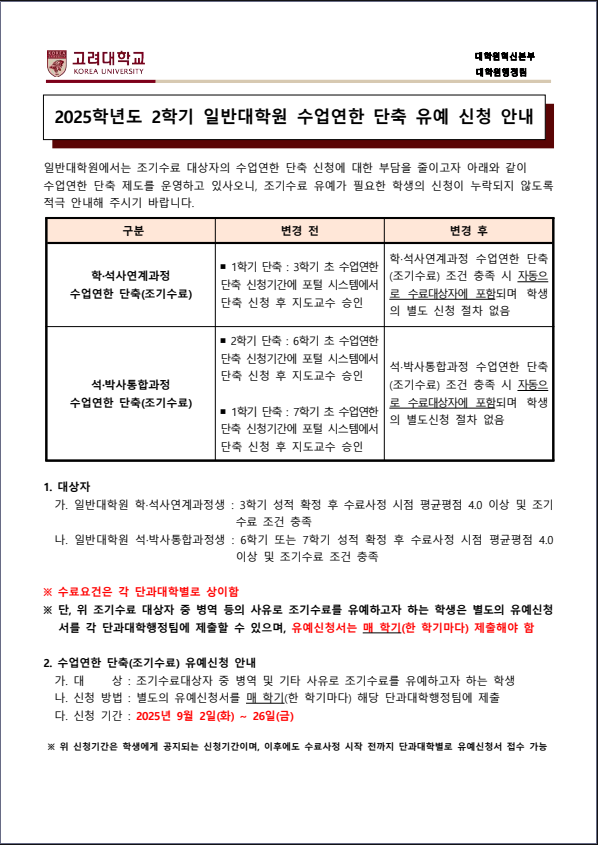 | 제목 | 2025학년도 2학기 대학원 수업연한 단축 유예 신청 안내 |